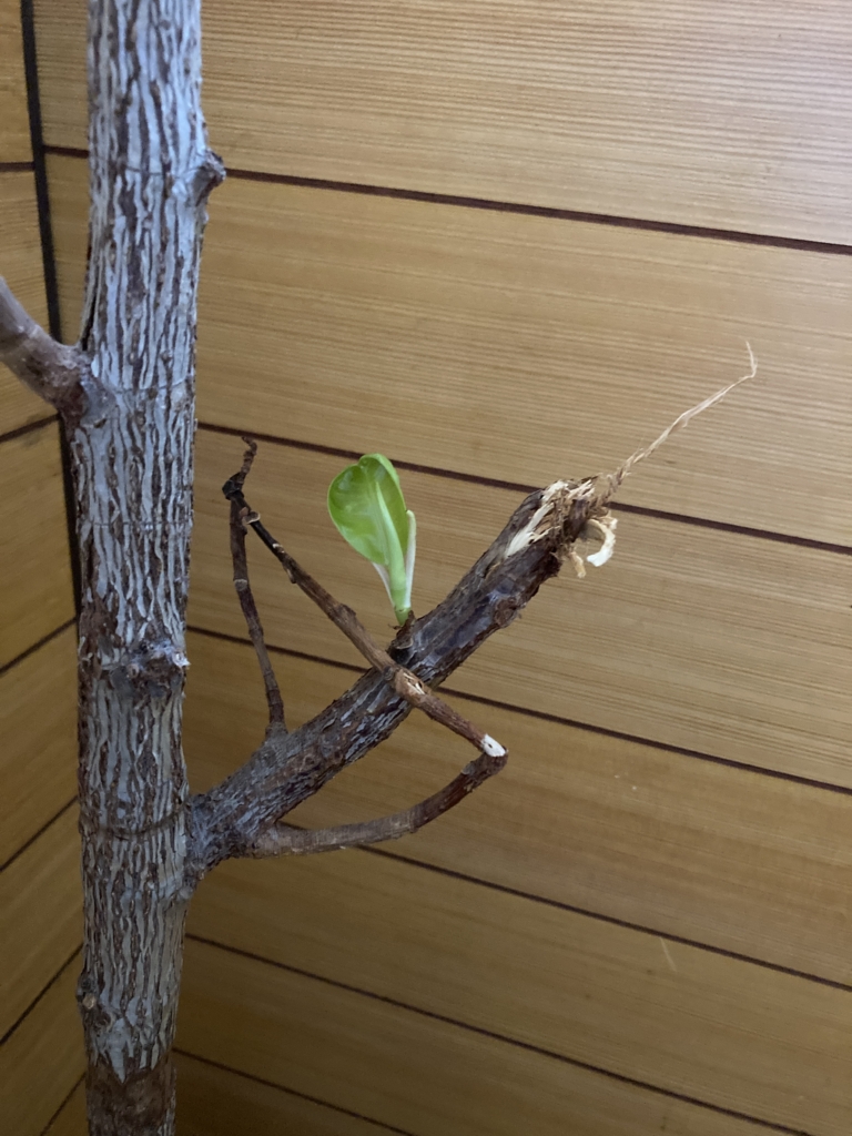それが昨日、折れたところから新しい葉が生えてきていることに気づきました。ゴムの木も静かではありますが逞しく生きているんだなあと、嬉しくなりました。