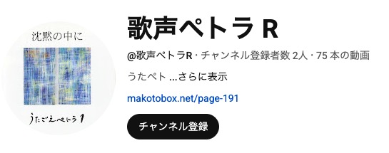 最近YouTubeのMAKOTO BOXチャンネルが投稿数の関係で「歌声ペトラ」チャンネル的になってきていて、MAKOTO BOXのチャンネルとしてはいかがなものかと思っていました。そもそも投稿しているのは自分ですから、いかがなものかも、いかがなものかですが、そろそろ別チャンネルにした方が良いと思いこの度実行に移すことにしました。