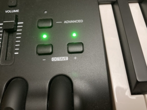 その時のトラブルの状態はMacで認識しなくなったということです。見た目の症状としては音域を上下するところにあるインジケーターの緑ランプ(写真のライト)が点滅していることでした。
