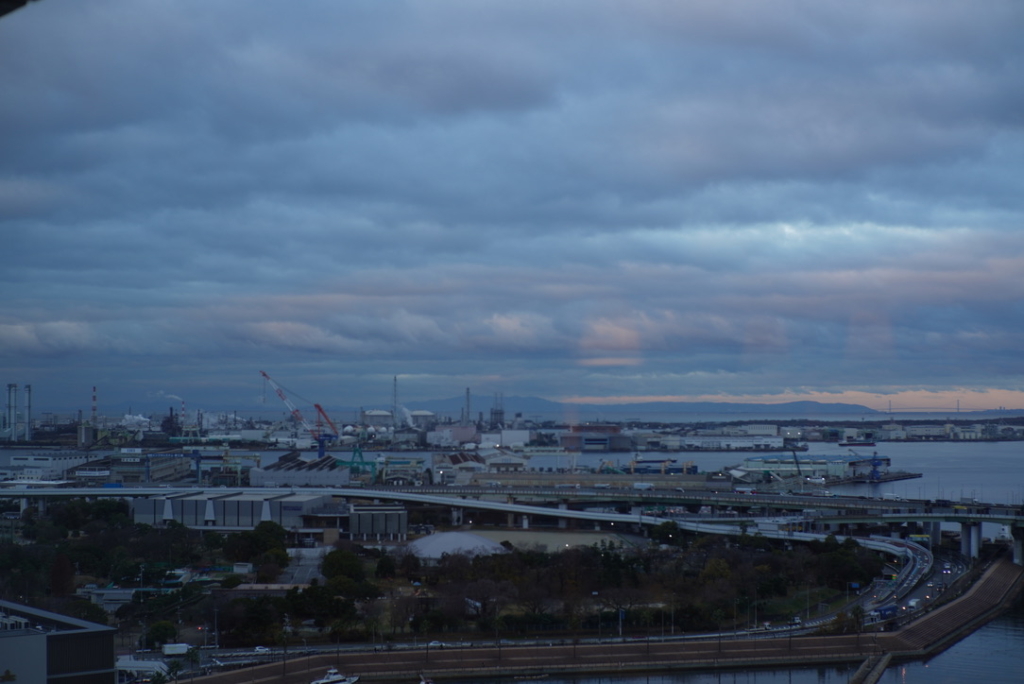 これは多分f=8以上に絞って撮ったんだと思います。まだ外が暗いということがありますし、ホテルの窓越しということもあるでしょうが、ぼやけていますね。