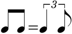 演奏がシャッフル(跳ねた感じ)の場合はこのスイング記号を使うと記譜が楽になります。というのはこの指定があれば右の3連譜で書くところを左の8分音符で書いておくことが可能だからです。