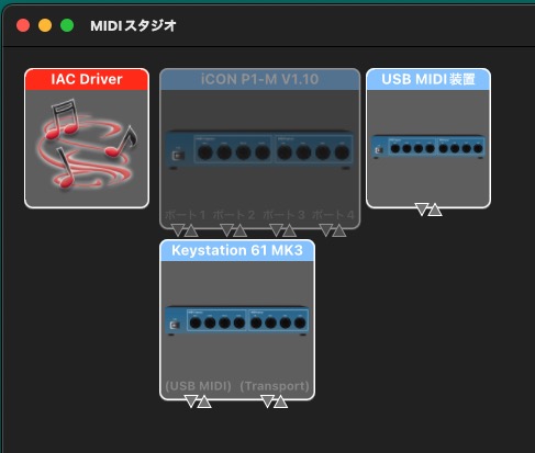 Keystation61というのがキーボードです。その上のグレーになっているのはフィジカルコントローラーですが、この時は電源オフにしているのでグレー表示になっています。